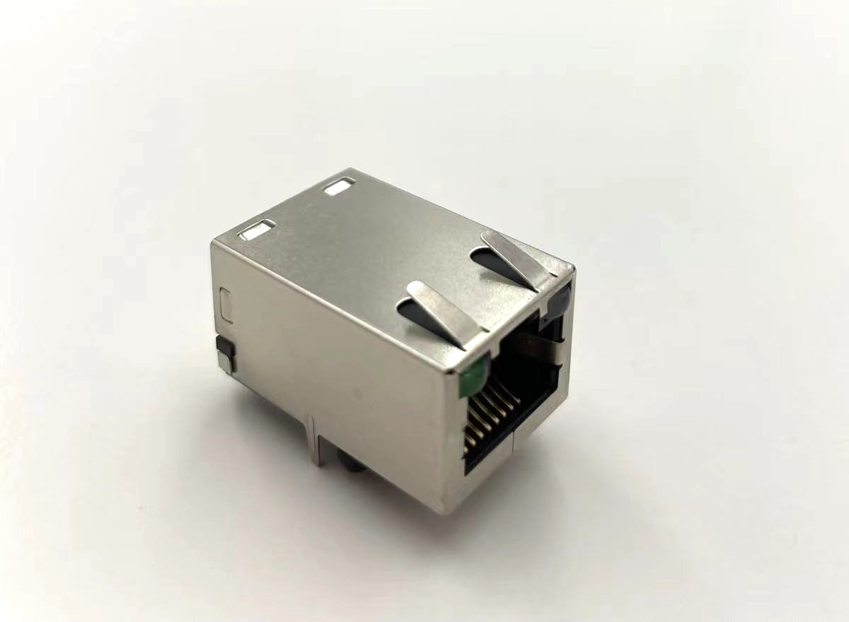 Single-port RJ45 1G transformer integrated female connector with LED indicators. Designed for stable Ethernet signal transmission, it combines magnetics, shielding, and status LEDs in a compact form. The built-in EMI finger enhances grounding performance and reduces electromagnetic interference, making it suitable for networking, industrial, and communication equipment applications.