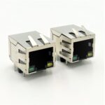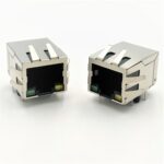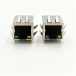 Single-port RJ45 10/100M transformer integrated female connector with LED indicators and EMI finger. Designed for stable Ethernet signal transmission, it combines magnetics, shielding, and status LEDs in a compact form. The built-in EMI finger enhances grounding performance and reduces electromagnetic interference, making it suitable for networking, industrial, and communication equipment applications.